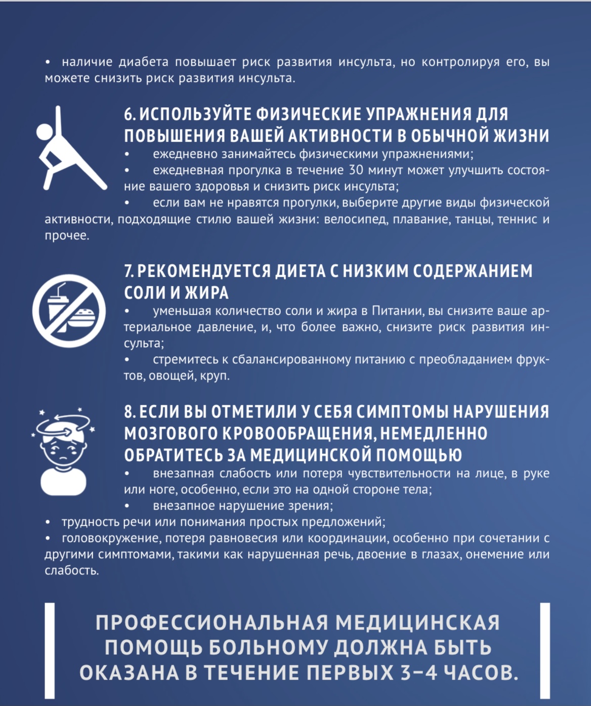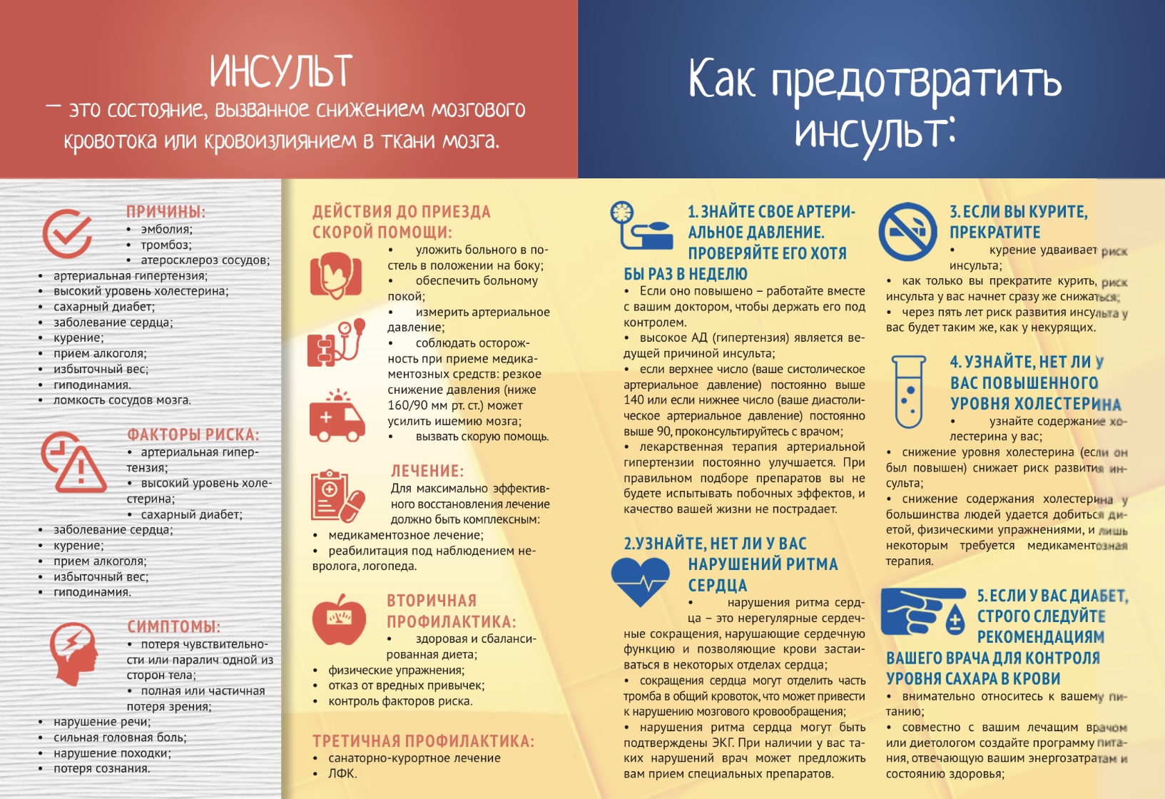 Главная задача мероприятий по первичной профилактике инсульта – повышение осведомленности населения о проблеме инсульта, о предупредительных мерах, а также о важности правильного и своевременного оказания первой помощи. Очень важно сразу распознать симптомы инсульта.