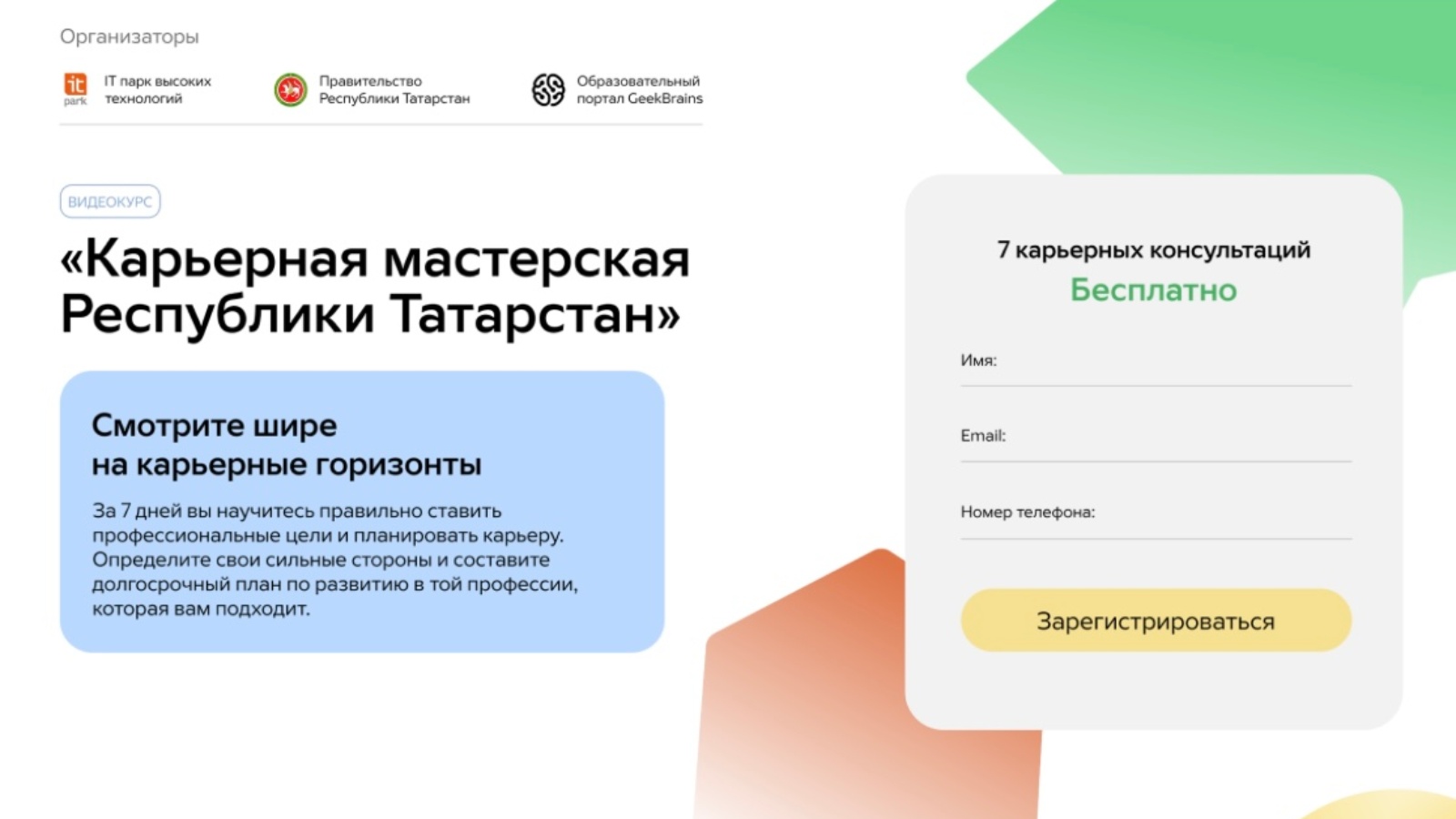 Министерство цифрового развития государственного управления, информационных технологий и связи Республики Татарстан совместно с образовательной платформой GeekBrains и ГАУ «ИТ-парк» запустило в регионе бесплатную программу по профессиональной ориентации «Карьерная мастерская».