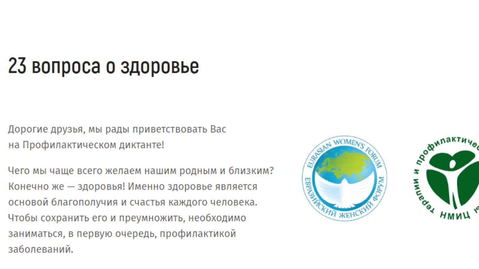 Совет Федерации совместно с Национальным медицинским исследовательским центром терапии и профилактической медицины Минздрава России проводят профилактический диктант «23 вопроса о здоровье».