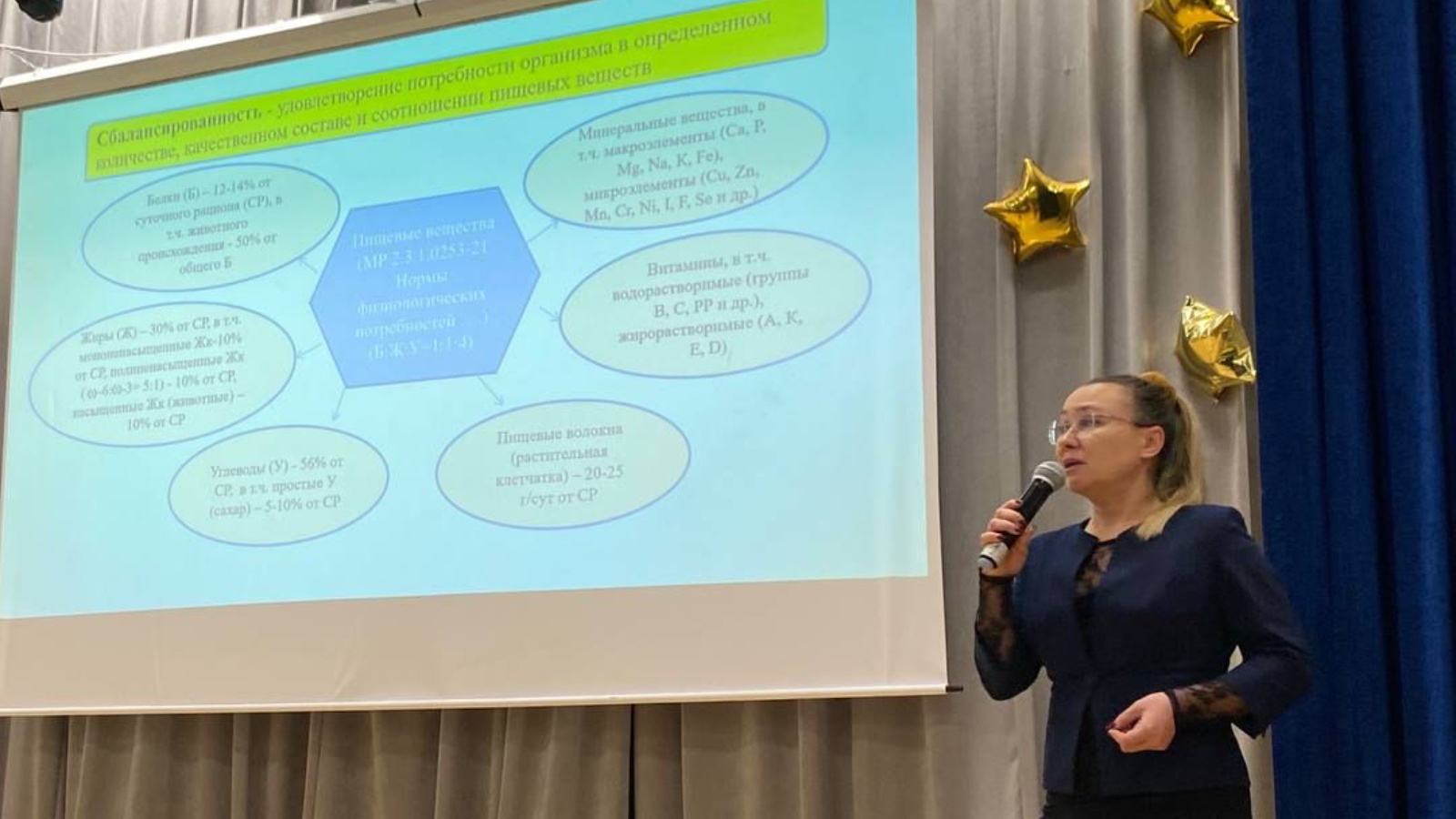 В ходе выступления Гузель Мухутдинова рассмотрела вопросы рациона питания по энергопотреблению, сбалансированности белков, жиров и углеводов, соблюдения питьевого режима. Также врач научила обучающихся определять свой индекс массы тела.
